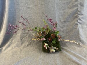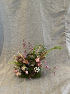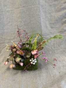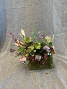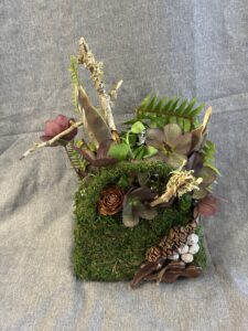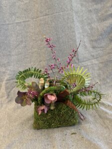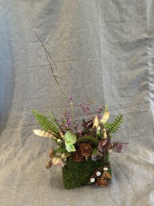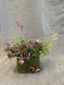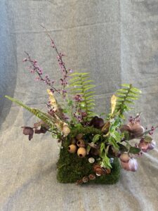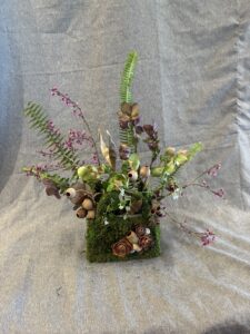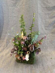 Botanical: Leatherleaf Fern, Hellebore, Forget me not, Redbud branches, Bell Eucalyptus Seed pods on stem, wood branch with litchen